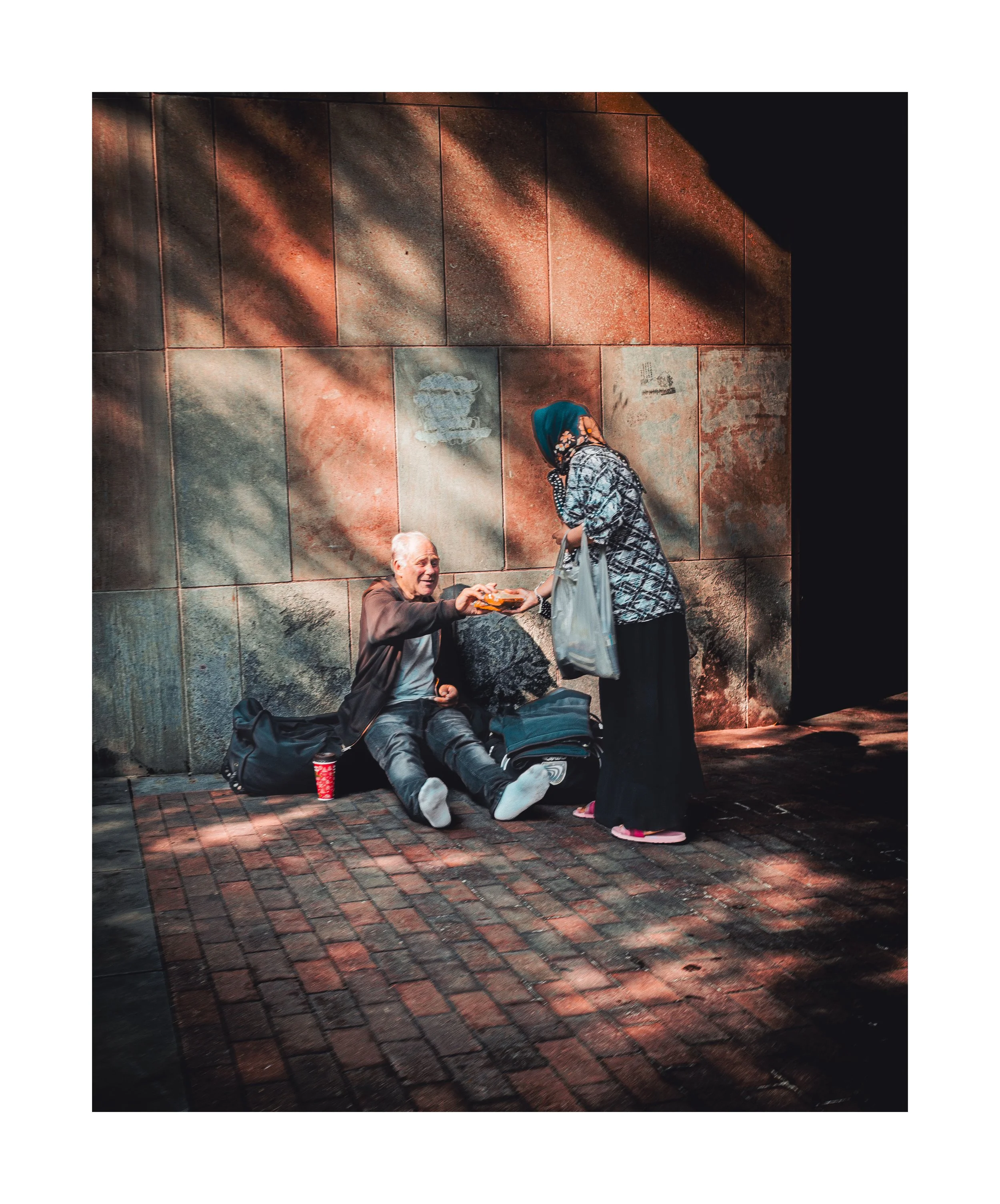 This photo was captured on 08/06/21. Walking to an appointment I noticed a man sitting against a wall. He was some distance away but what caught my eye was the light and shadows cast on the wall that I thought would really stand out in a photo. It was some distance away but I decided to turn back and get closer and see what I could get. As I was about 50 feet away a lady walked in front of me and was heading in the same direction. She veered towards the man and I thought under my breath “nooooo you’re going to block my shot”. So I slowed down a bit but realized she was going to talk with the man and the shot I visualized was gone.