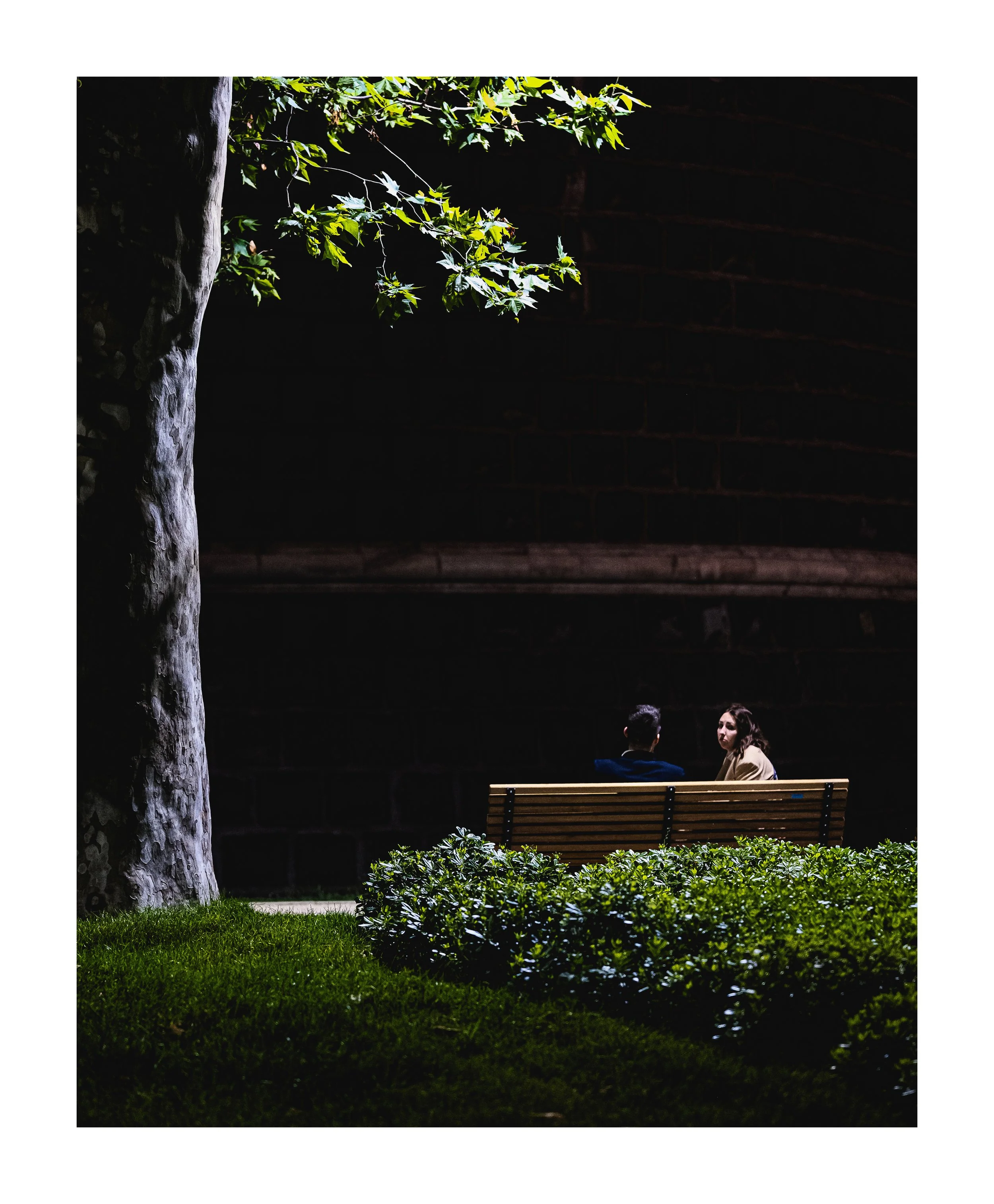 Walking at night in Milan, Italy I was attracted to a bench under a large tree lit only by a lamp post. Sitting is a woman with the light casting on her face revealing a dark mysterious figure beside her. A shady business deal? A secret rendezvous? A relationship coming to an end? Whatever the story behind the meeting “All darkness comes to light” - Night Shade.